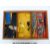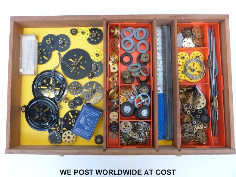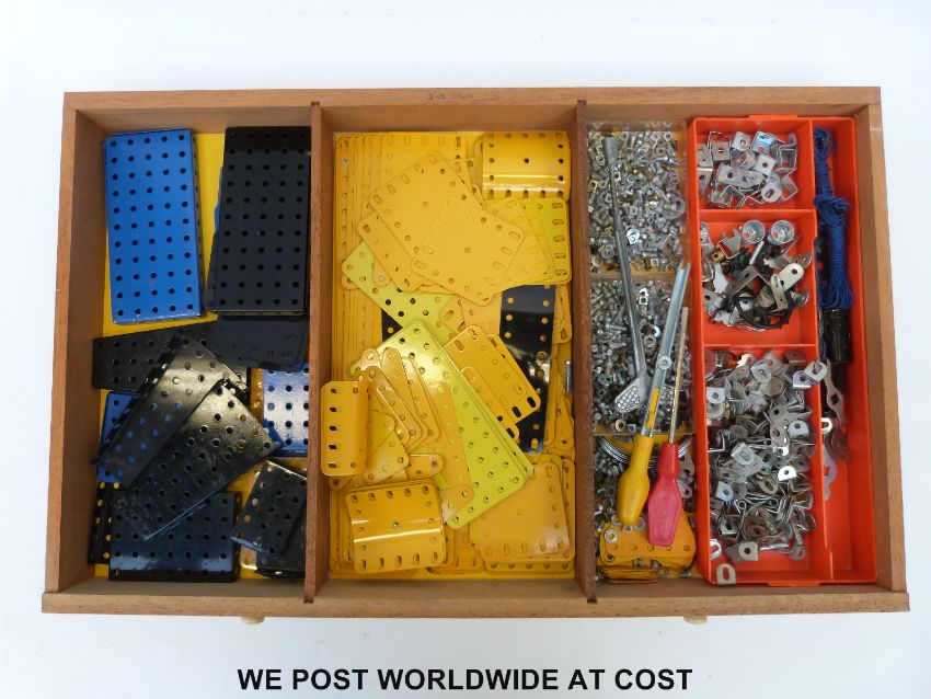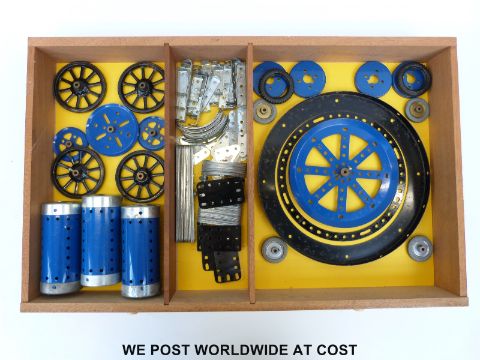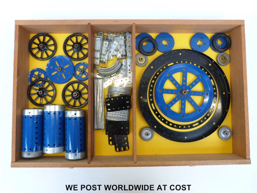 A Meccano Outfit No 10 in oak four-drawer cabinet, comprising mainly blue and yellow compents