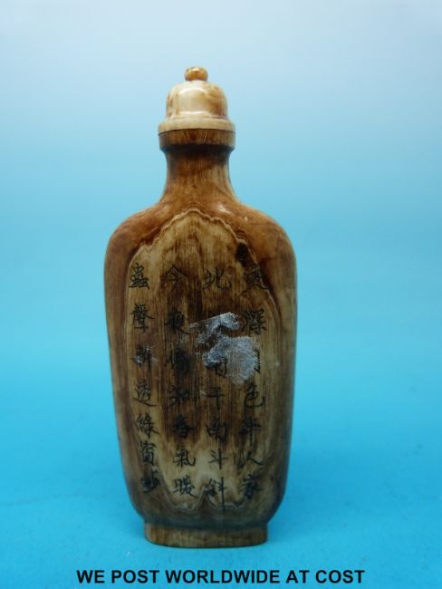 A Chinese ivory snuff bottle with carved landscape scene and calligraphy to back