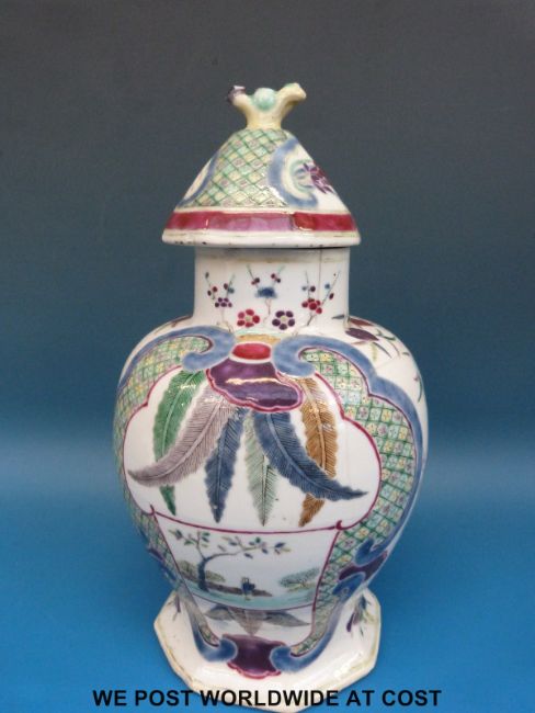 An 18th/19thC Chinese lidded vase decorated with two central figural cartouches surrounded by feathers and fruit, six character mark to base (24cm tall)
