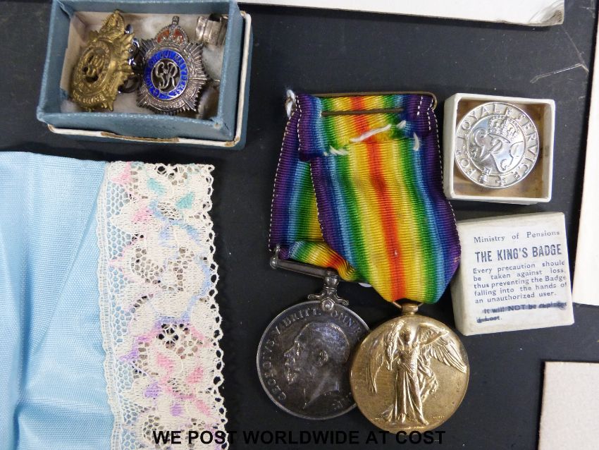A pair of WWI medals awarded to 497108 SPR. H.C. Weston R.E, together with a Loyal Service badge, sweetheart badges, Spitfire brooch stamped 'Forest of Dean', and a piece of shrapnel. Photograph of 1945 officer's school, ephemera and handkerchief relating to end of WWII etc