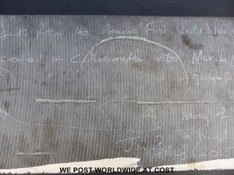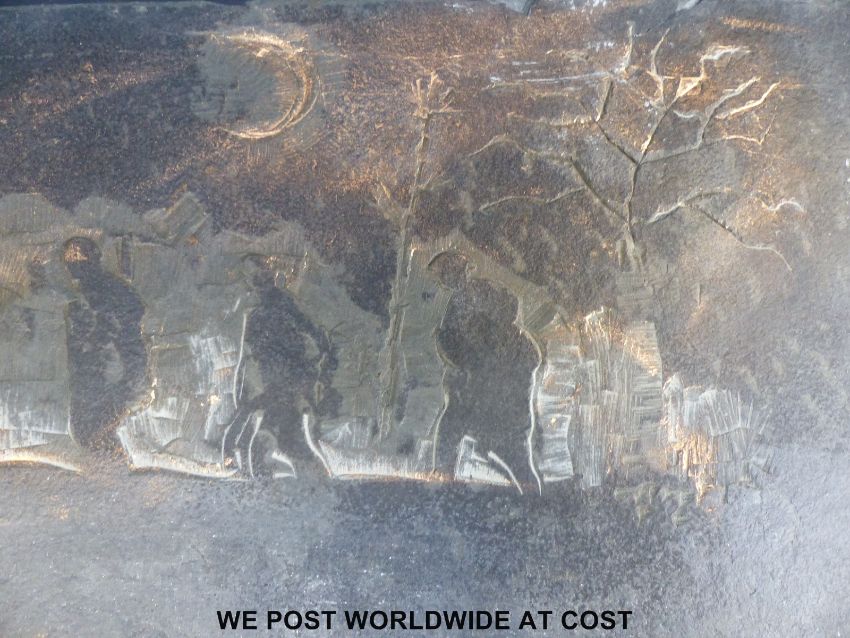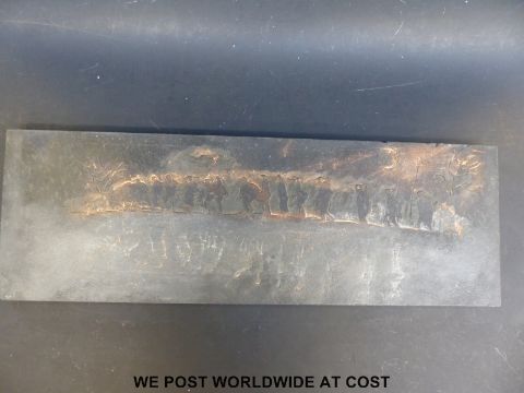 WWI interest carved slate panel depicting soldiers moving at night with shell fire beyond, the scene illuminated by moonlight, with script verso giving details (20 x 60cm)