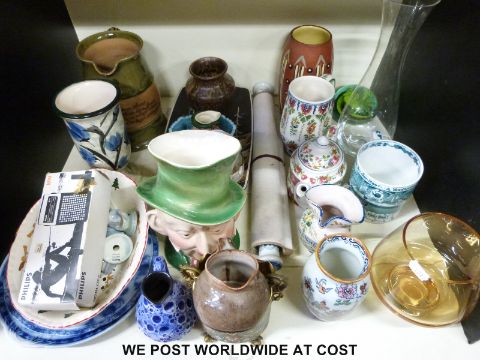 A collection of ceramics including Wade Tinker, Tailor, Soldier, Sailor series, Royal Doulton 'He That Buys' jug, Beswick character jug Micawber, Delft ware etc