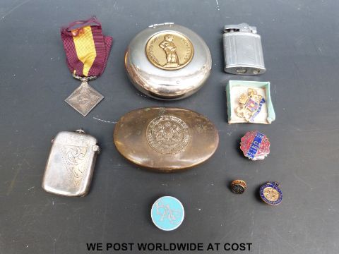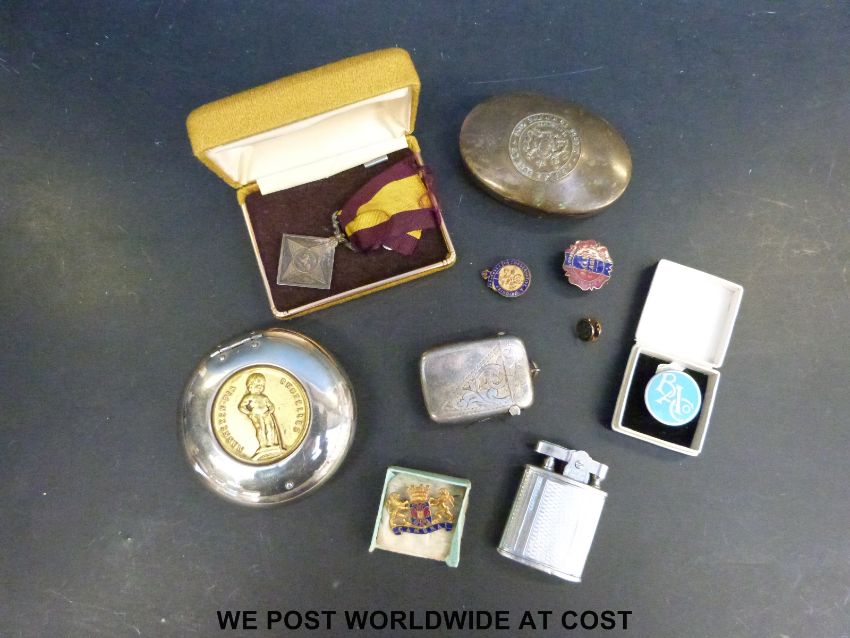 A quantity of badges and other collectables to include Bristol Aircraft buttonhole badge, Fry's brass tin, vesta, lighter, Army Temperance Association India medal etc