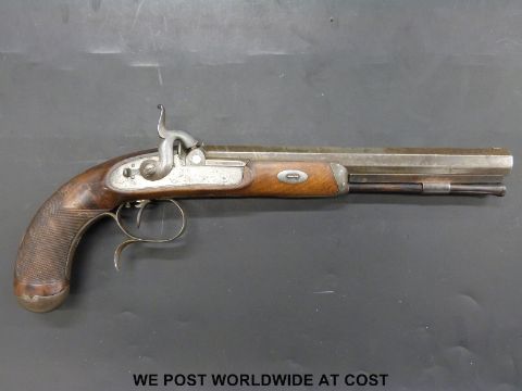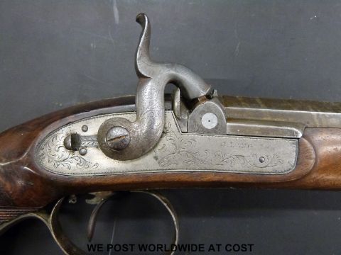 Joseph Lang 50 bore percussion hammer action target pistol with 23cm octagonal barrel, ornately engraved and named bolted lock, engraved dolphin hammer, spur trigger guard and chequered gip, c1850 (overall length 39cm).