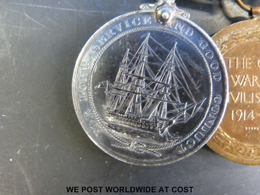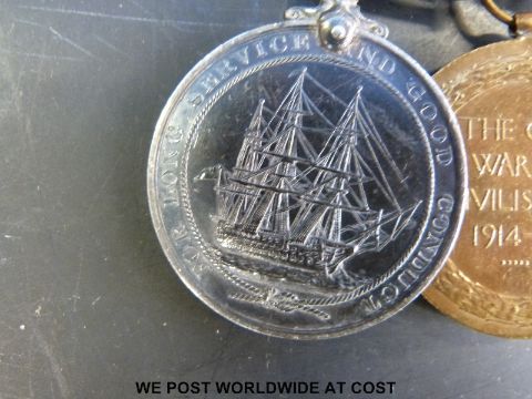 A Naval WWI group of four medals comprising 1914-15 star marked K12058 T.W.Reeves Act.L.Sto.R, 1914-18 and Great War medals both marked K12058 T.W.Reeves S.P.O R.N and George V long service medal marked K12058 T.W.Reeves S.P.O HMS Vindictive