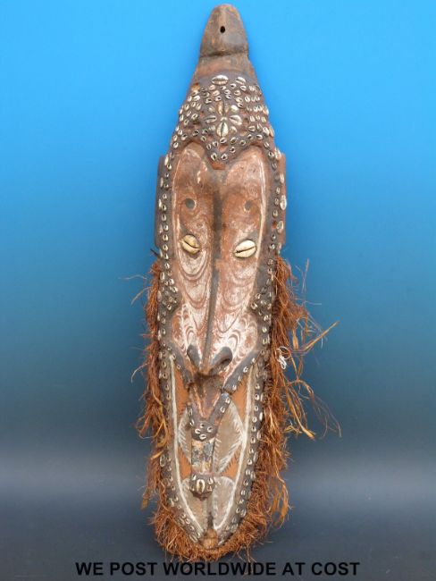 An African tribal mask with shell and painted decoration, Papa New Guinea (length 77cm)