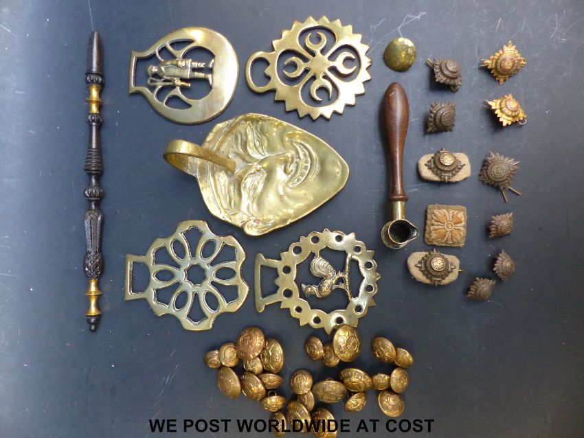 A collection of military buttons and 'pips' together with a Victorian shot measure, horse brasses etc