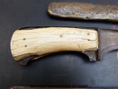 An ivory handled peshkab in a chased brass sheath (length overall 47cm) together with a bugis keris dagger, thought to be of Malay origin