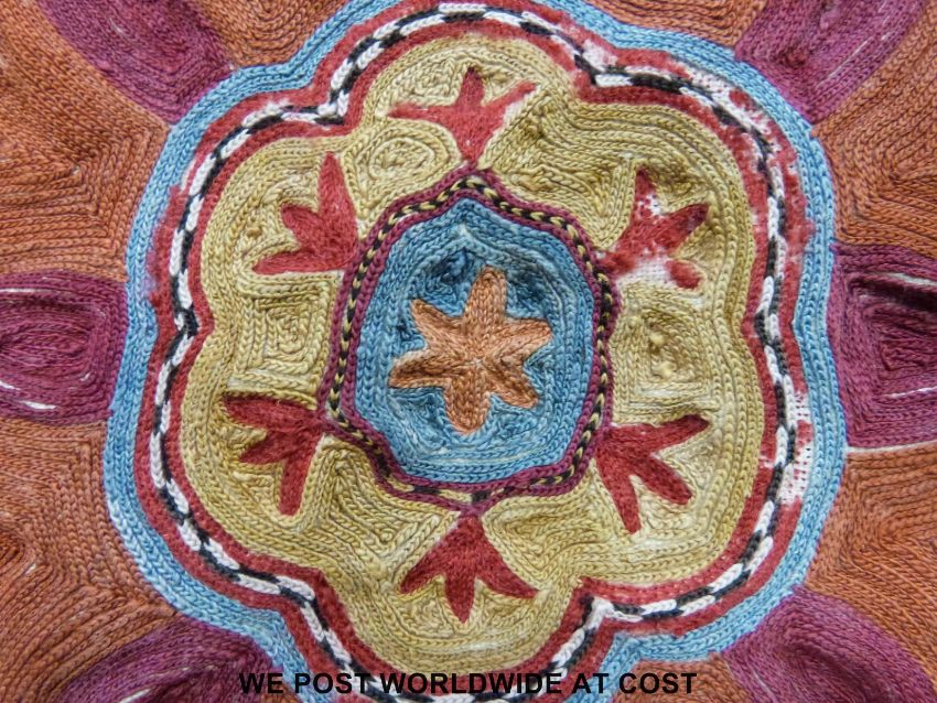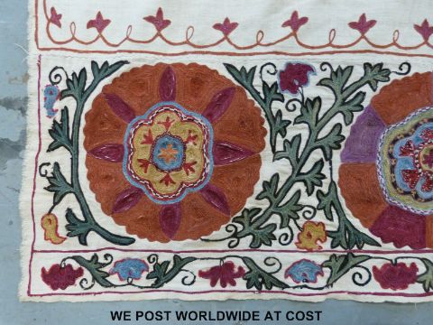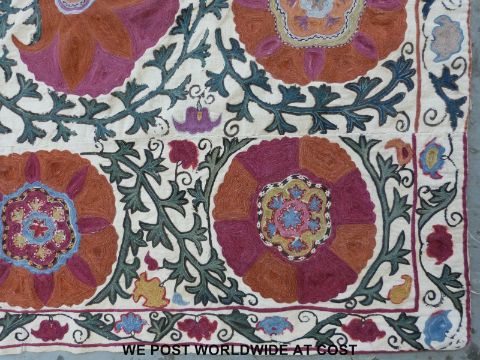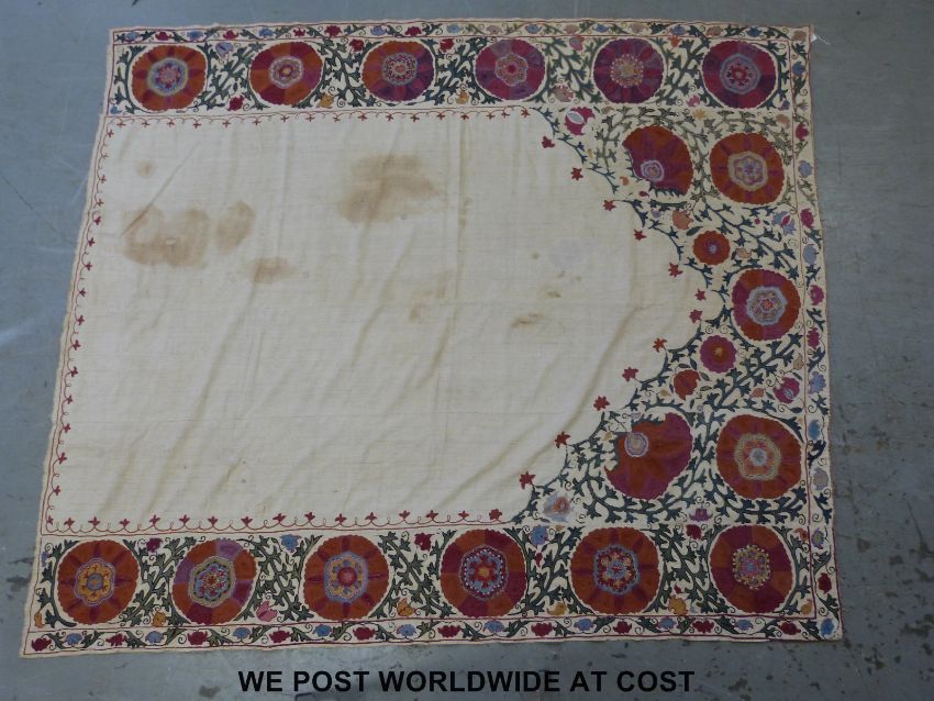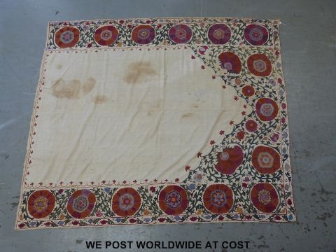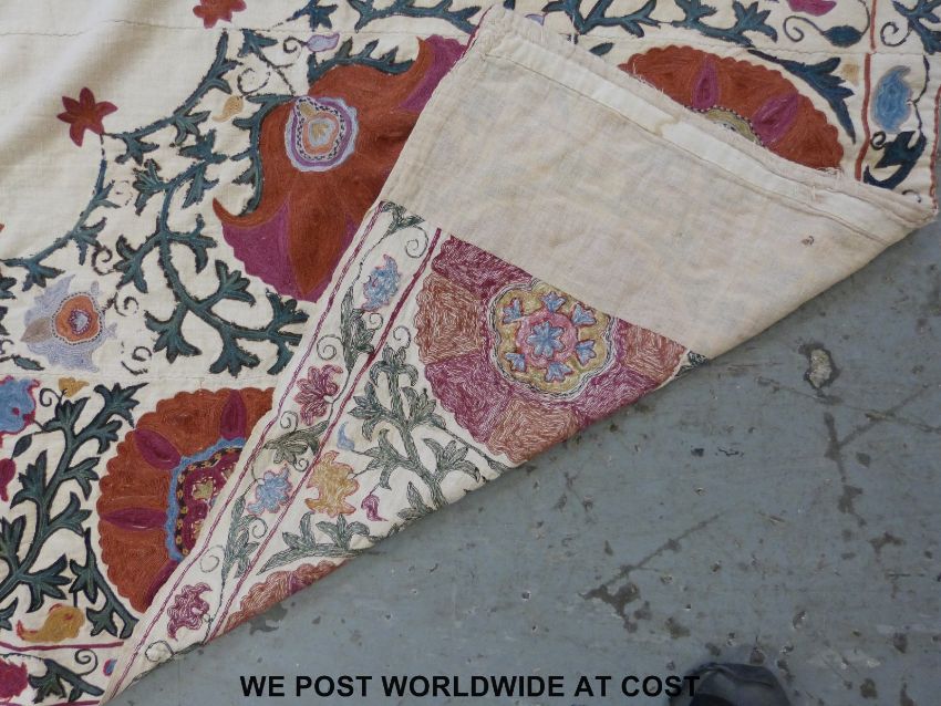 An 18thC Suzani embroidered panel or throw with hand finished decoration of foliage on a cream ground, the central flowers finished in pink and orange