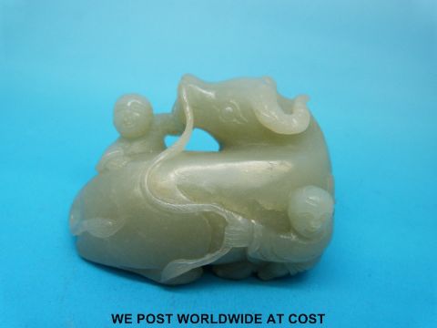 A Chinese carved jadeite water buffalo with two boys on its back (length 6.5cm)