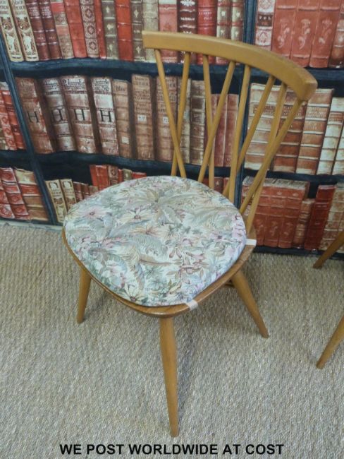 A light elm Ercol table (L112 x W126 x H72cm) and four chairs with cross stick backs