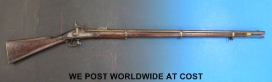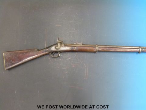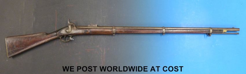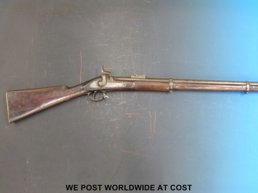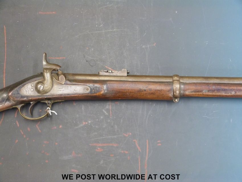 Enfield 3 band percussion hammer action rifle with lock stamped Tower 1861 and with crown over VR cipher, spiralling decoration to stock and 39in barrel, overall length 137cm, with certificate.