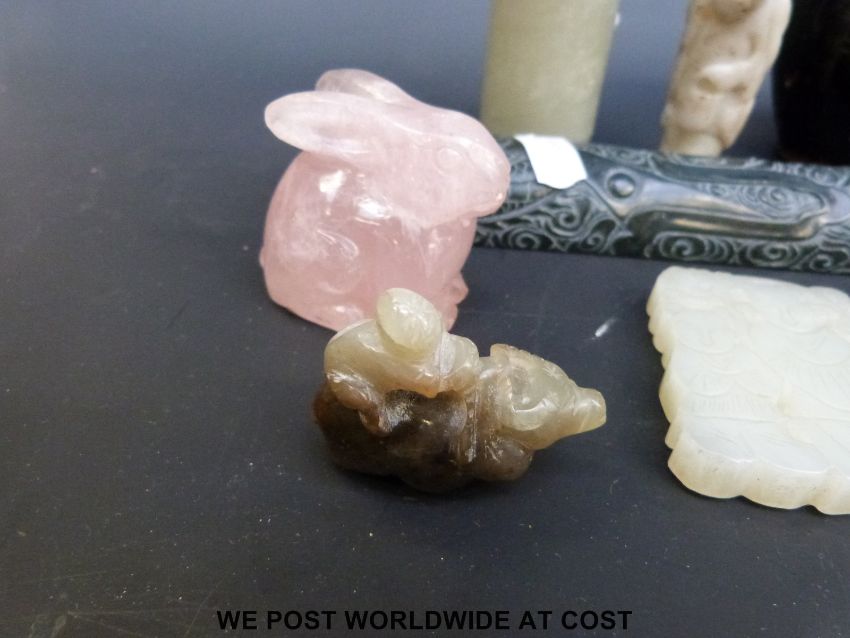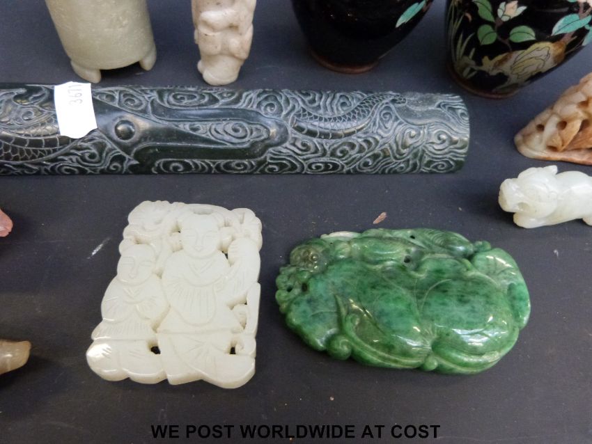 A pair of Chinese cloisonne vases, jadeite vase, rose quartz rabbit, two jadeite carvings, other hardstone carvings etc