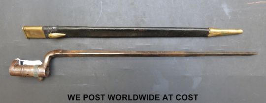 A British 19thC socket bayonet with triangular section blade, in brass and leather scabbard (overall length 57cm)