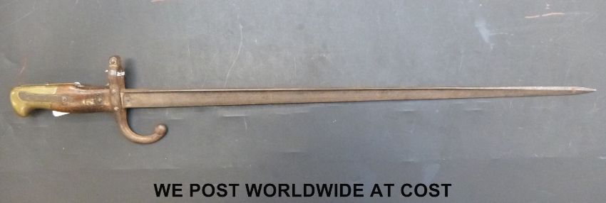 A c1877 French bayonet with the narrow 'T' form blade, with wood grips and brass pommel. Overall length approximately 64.3cm, blade length approximately 52.2cm, M R stamped to blade, L 94672 to quillon