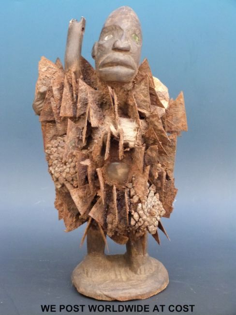 An African tribal figure with glass eyes and jagged metal decoration (32cm tall)