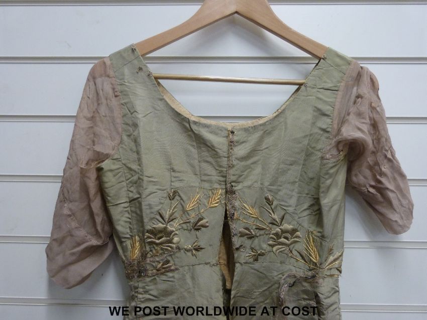 A late Georgian /early Victorian satin dress with embroidered flowers and foliate decoration to the front and back with matching silk and cord sleeves