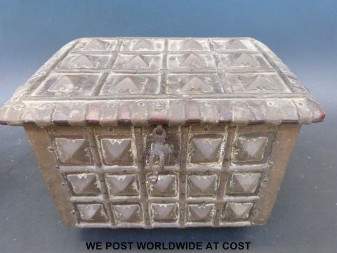 A 19thC Indian carved wooden box with hobnail decoration (27x18x20cm)
