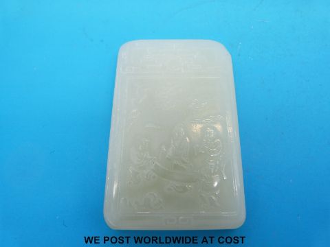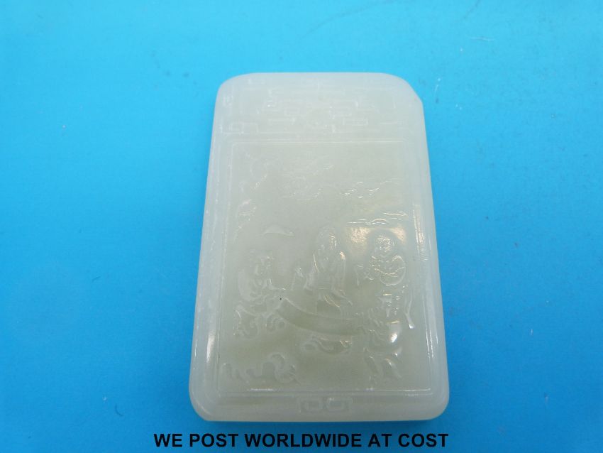 A rectangular jadeite pendant carved with calligraphy to one side, carved figures to the other