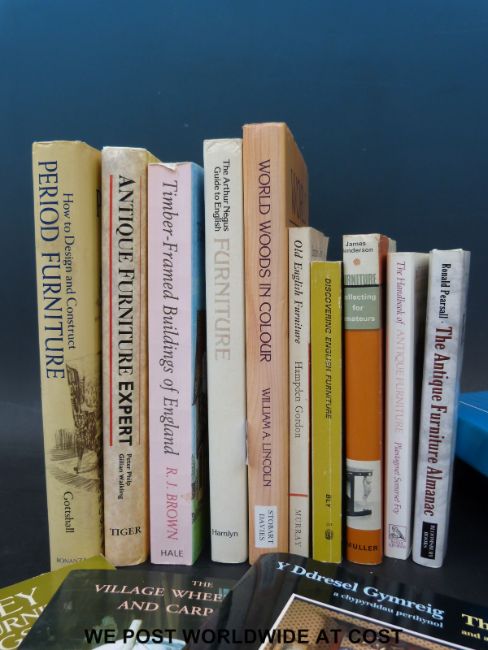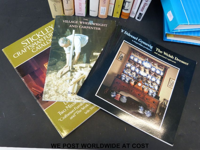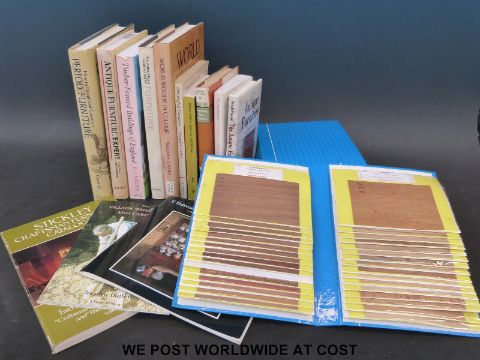 A collection of wood veneer specimen samples in three albums labelled with generic and Latin names, together with a collection of furniture and woodworking related books