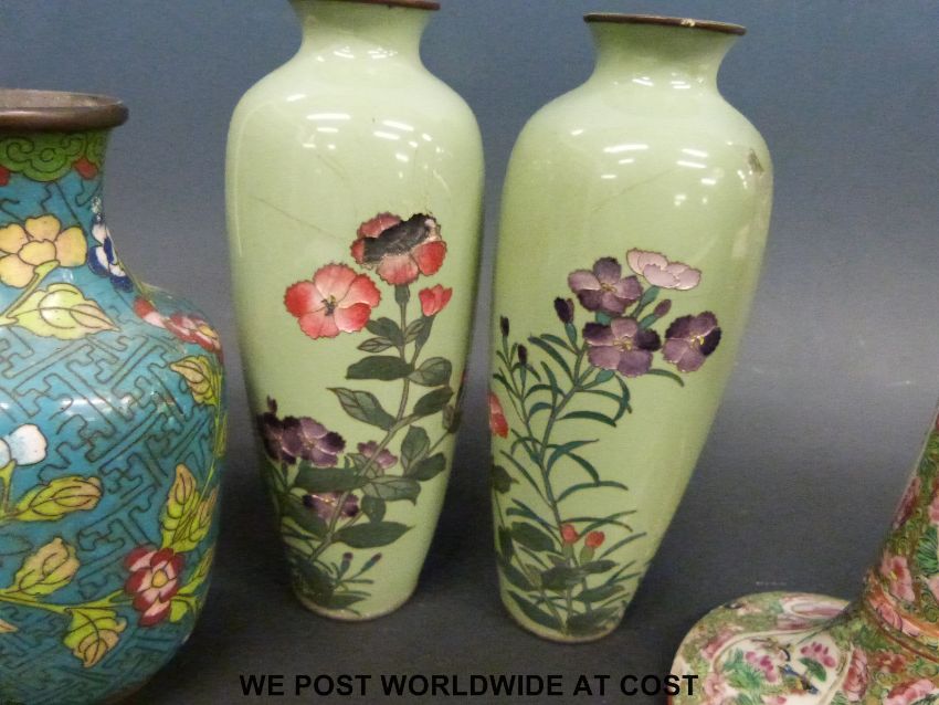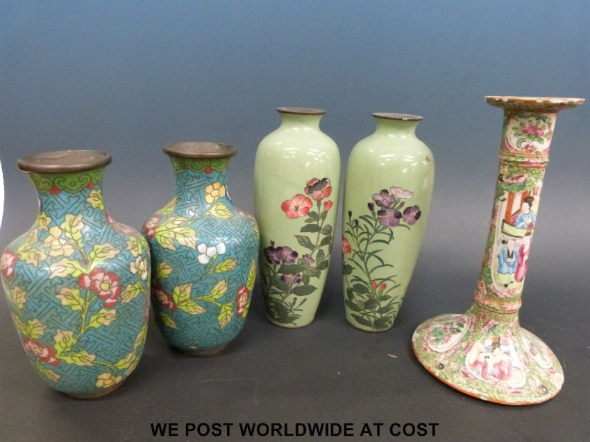 Two pairs of cloisonne vases and a 19thC Chinese famille rose candlestick