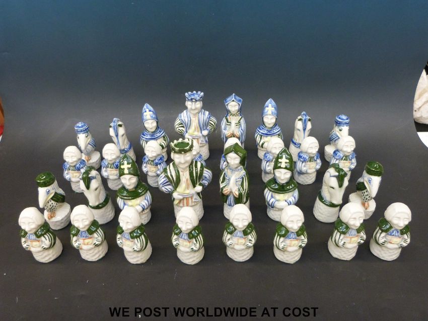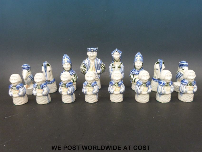 A ceramic Delft style chess set, height of king 15.5cm.