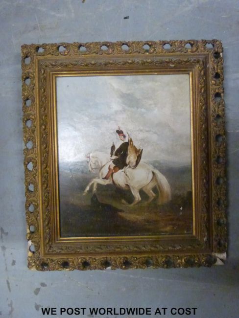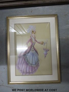 An oil on canvas of a lady with fur stole, together with a watercolour of a lady sitting on a fence, a fashion drawing of a lady in period dress (indistinctly signed and possibly dated 82) and an oil of a man on horseback
