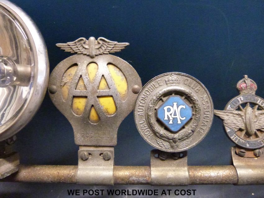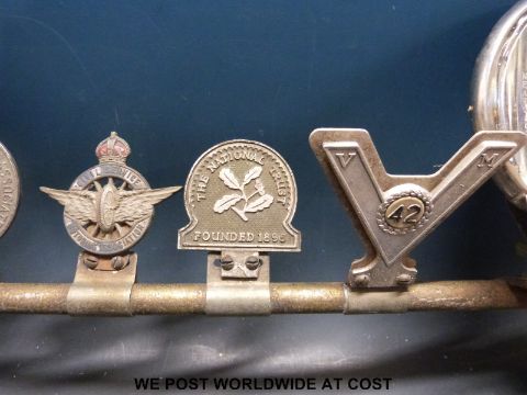 A chrome car bumper bar mounted with various RAC, AA with service and other badges