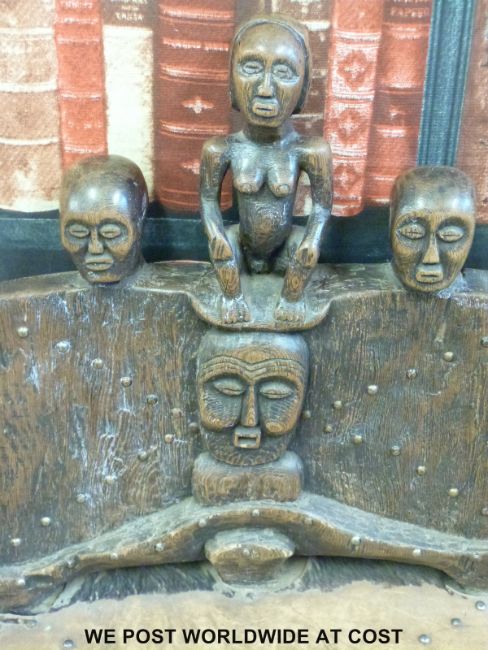 A Chokwe chief's chair carved with typical Chokwe faces and figures with hide and stud decoration (bought in the 1960's from an English ex pat teacher living in Zambia) (85cm tall)