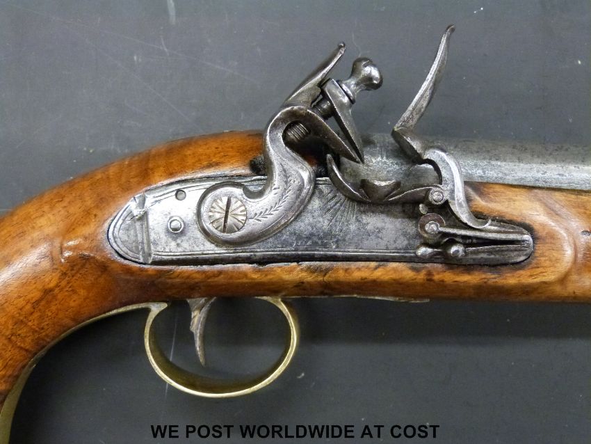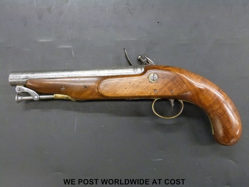 Private purchase flintlock hammer action New Land pistol , with 20cm steel barrel named London and stamped with proof marks, brass mounts and captive ramrod, c1800 (overall length 36cm)
