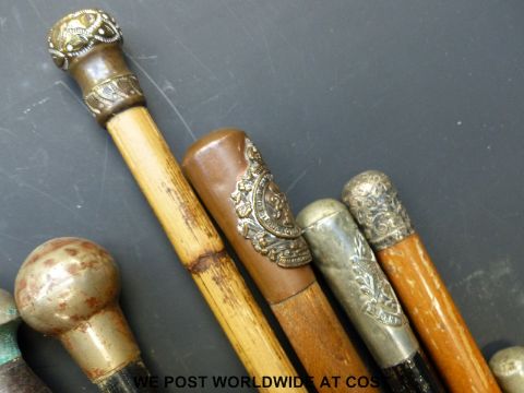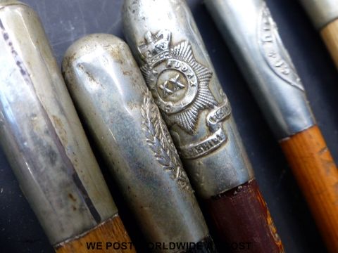 Approximately 25 military and other swagger sticks contained in two shell cases, to include Cheshire, Gloucestershire and Border Regiments, Royal Engineers etc., some hallmarked silver