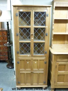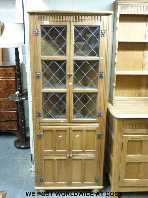 A light oak glazed corner cupboard in the Arts and Crafts style (H169 x W68 x D35cm)
