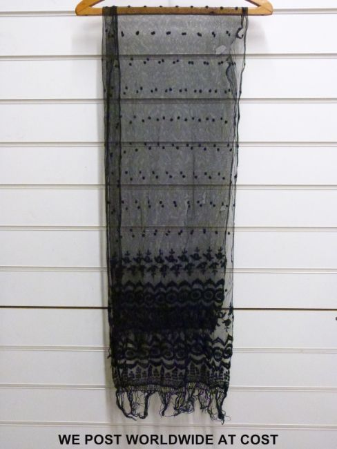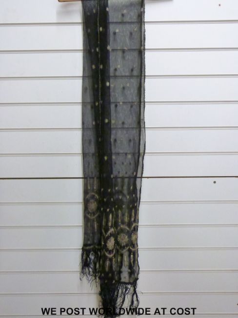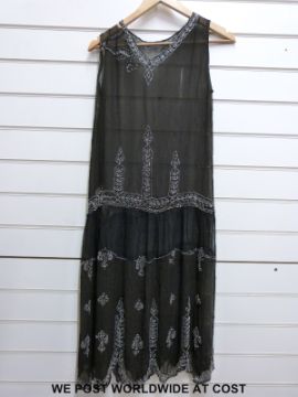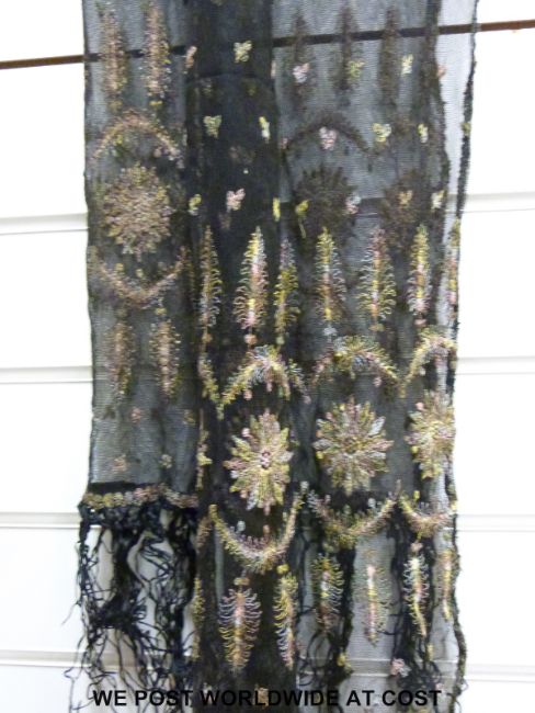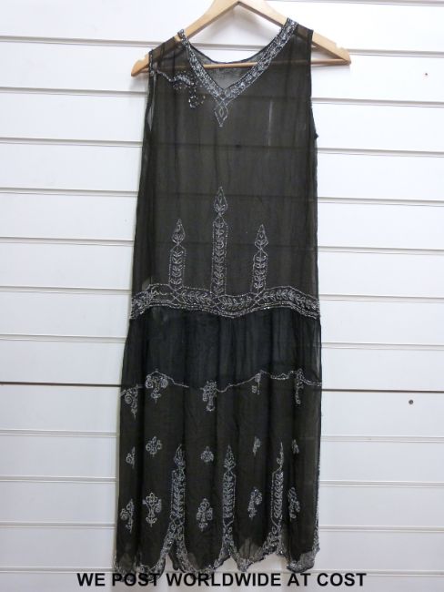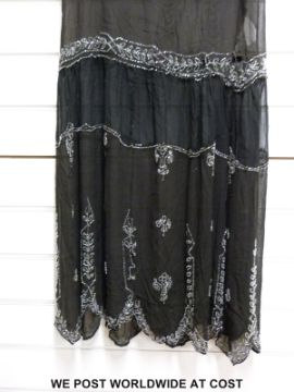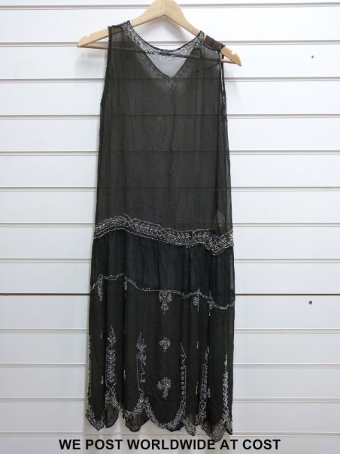 A 1920's chiffon cocktail dress with crystal beadwork and two embroidered shawls of similar age