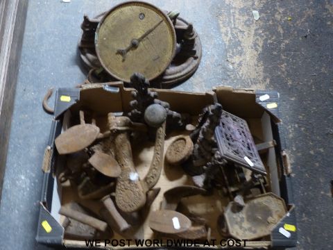 A quantity of metalware to include bar mounted corkscrew, Salter spring balance etc