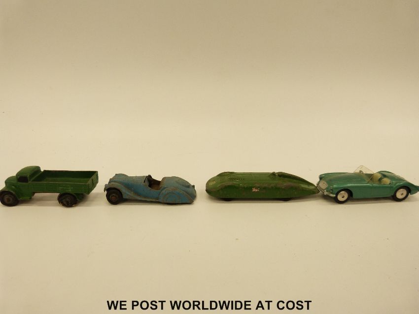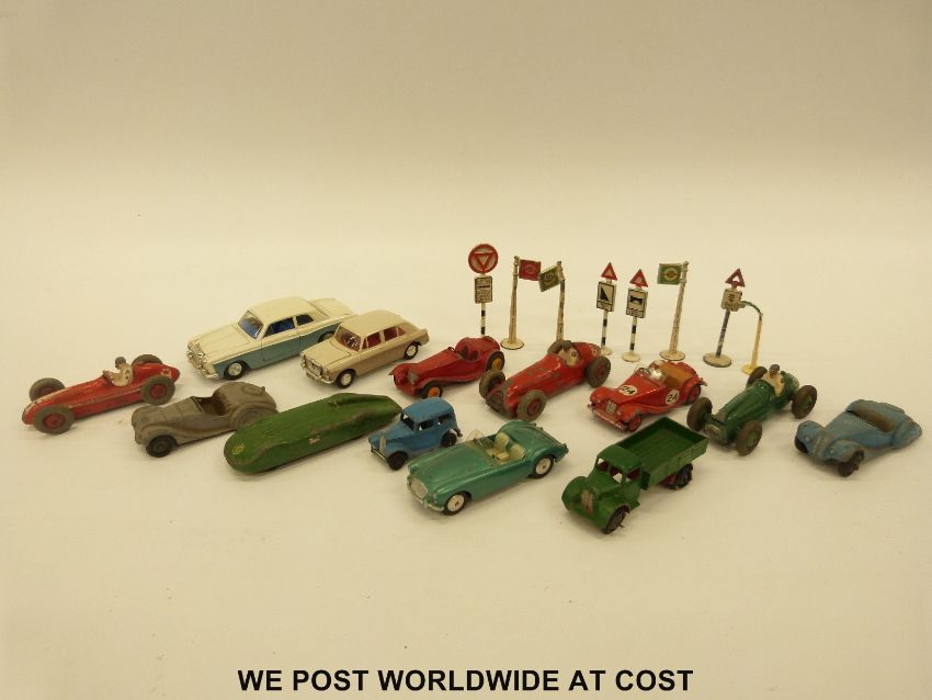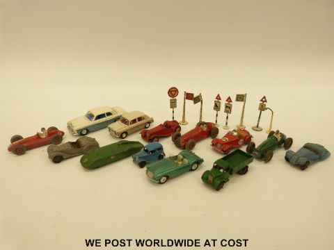Thirteen Corgi, Dinky and Spot-on diecast model vehicles together with nine Dinky road signs and bus stops.