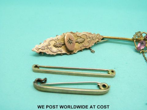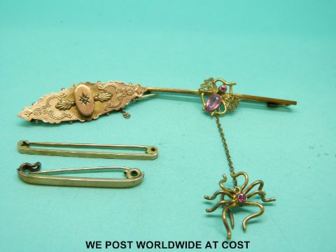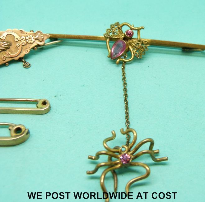 A 9ct gold brooch set with a diamond, two 9ct gold brooches and a bar brooch decorated with a fly and spider
