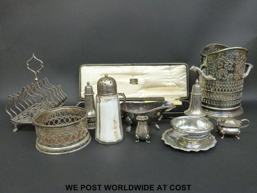 A quantity of silver plate to include a Walker & Hall wine bottle holder, fish servers, toast rack etc