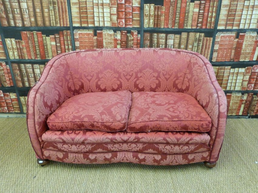 A 19th/20thC two seater burgundy upholstered sofa on oak bun feet and metal castors