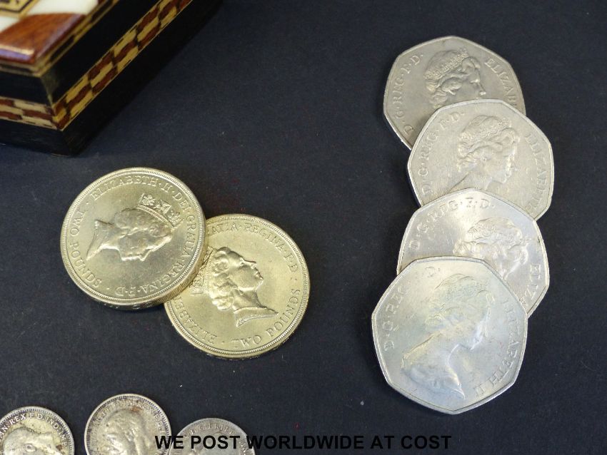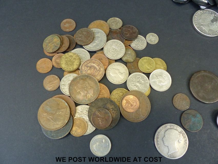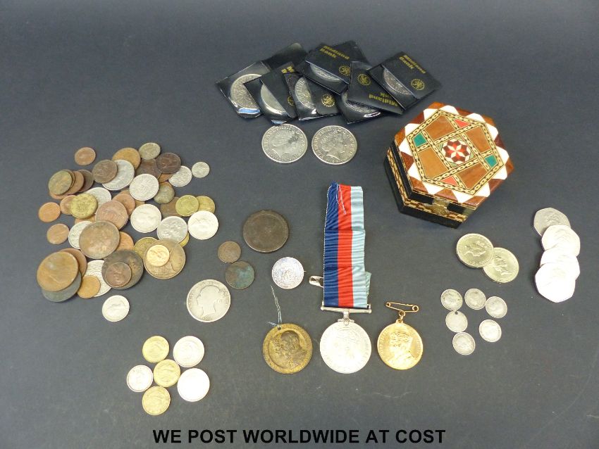 A small collection of UK and world coinage and medals, George III onwards including Victorian half farthing, modern crowns, £5 coins, WWII Defence medal etc