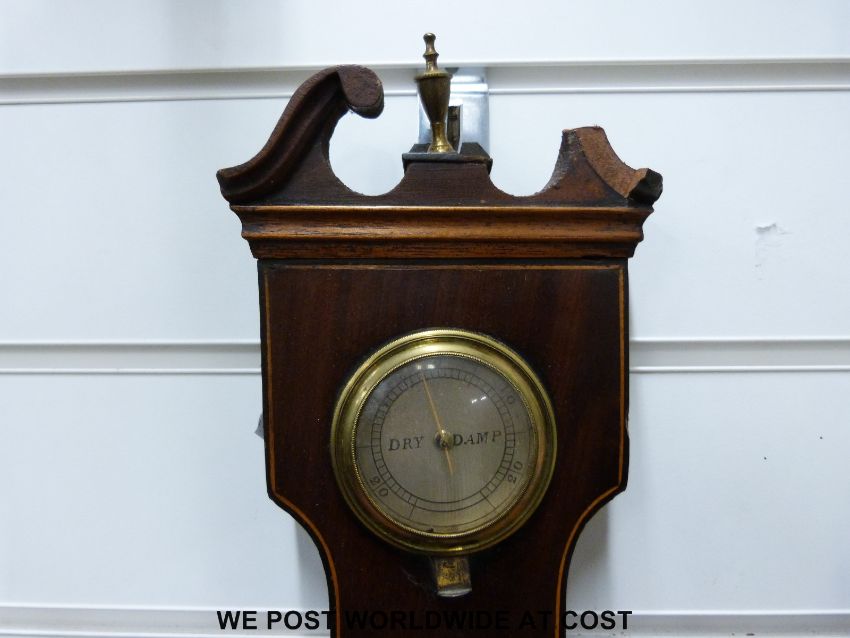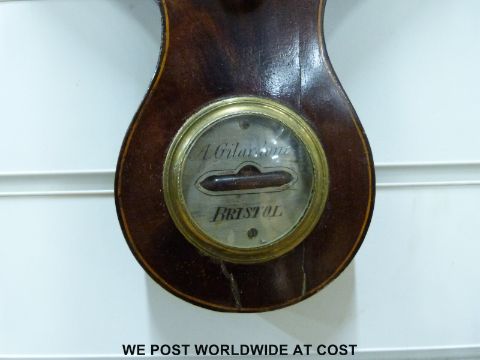 A. Gilardon Bristol, 19thC mahogany barometer with banded ebony and boxwood inlay, main dial 20cm diameter, inbuilt thermometer and hygrometer features