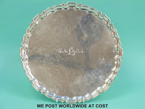 A hallmarked silver salver with shaped edge, raised on four paw feet, B'ham 1972 maker's mark BES Co, diameter 26cm (509g)