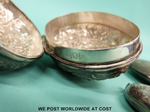 A Victorian hallmarked silver egg shaped box, length 8.5cm, London 1898, maker William Coryns & Sons Ltd, a George V hallmarked silver kidney shaped patch or pill box and a hallmarked silver purse (162g all in)