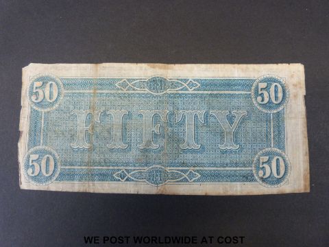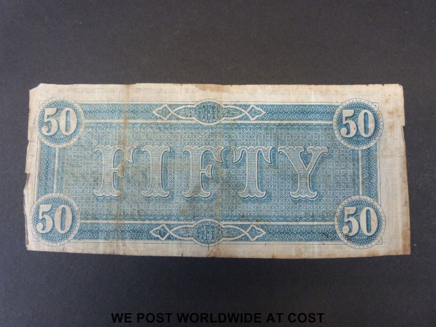 An 1861 50 dollar bill, Confederate States currency Civil War notes, for the State of Richmond no 15332
