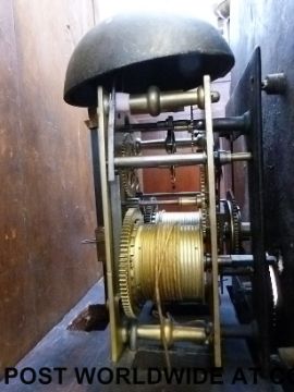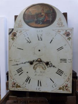 An early 19thC oak longcase clock by Thomas Mills, Berkeley, the movement of 8-day duration striking on a bell, the arched painted dial with Roman numerals and Arabic minutes, the corner paintings depict flowers, the arch featuring a lady on a garden bench with a flower basket. The arched door with banded inlaid decoration and shell centre inlay, the hood with brass rosette decoration to the swan neck pediments, columned sides with brass acanthus leaf capitols and central eagle finial (215cm tall)