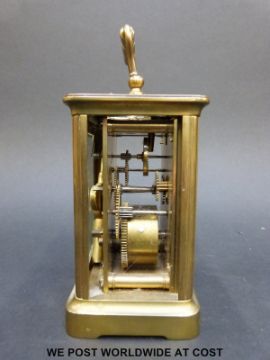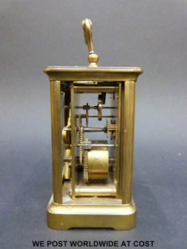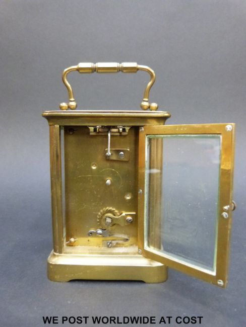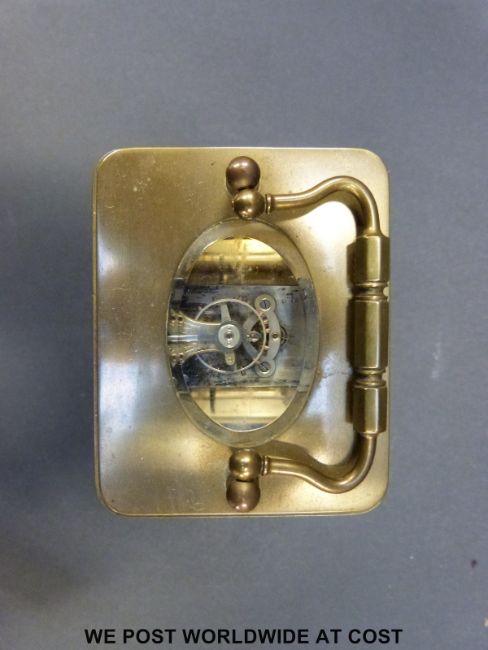 A late 18th/early 20thC brass cased carriage clock with ivory coloured enamel chapter ring, engraved decoration and key (10cm tall)