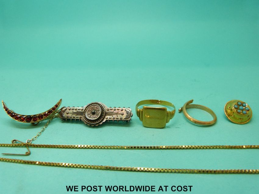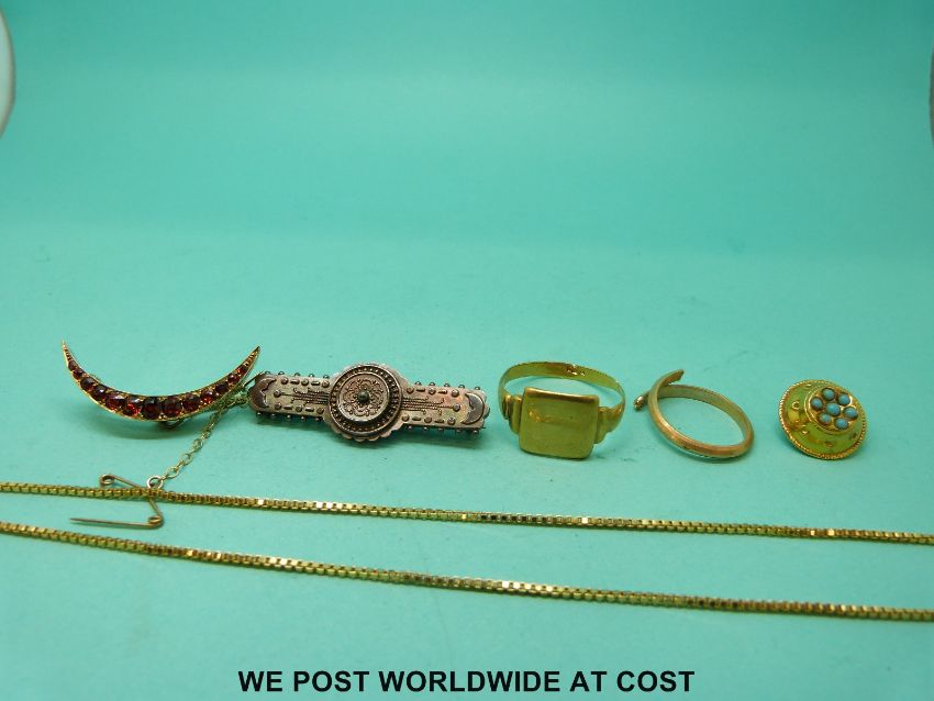 An 18ct gold signet ring and band (7.1g), 9ct gold necklace (3.5g), yellow metal brooch set with garnets, 15ct gold brooch (2.2g) etc