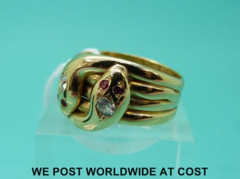 An 18ct gold ring in the form of two snakes entwined set with diamonds and rubies with Chester 1900 hallmark (size R)