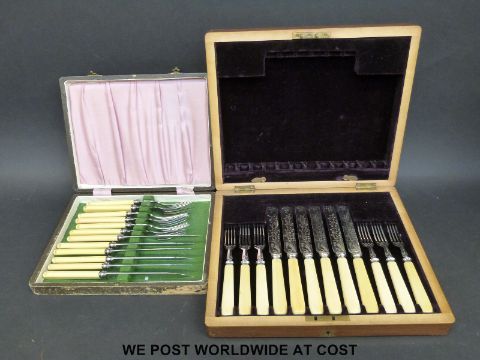 A collection of cased plated cutlery, desk tidy and inkwell, Elkington chamber stick etc