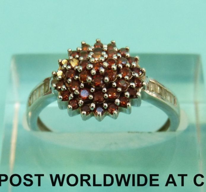 A 9ct white gold ring set with red diamonds and baguette cut diamonds to the shoulders (Size N, 2.3g)
