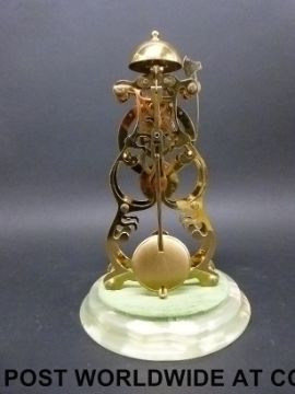 A brass skeleton clock under a dome (27cm tall)